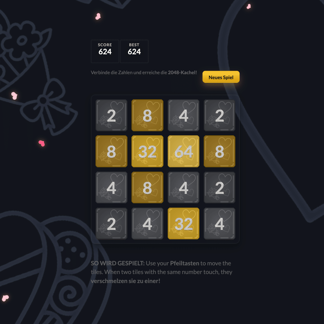 2 2048 In this number puzzle, the goal is to combine tiles with the same values on a game board. When merged, their value doubles. The objective is to reach the tile with the number 2048. This requires some foresight to avoid blocking the board, as a new tile appears after every move. Play 2048